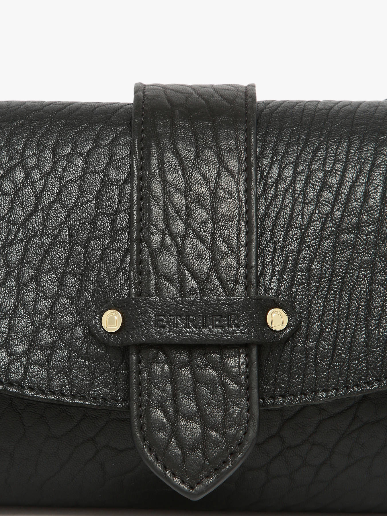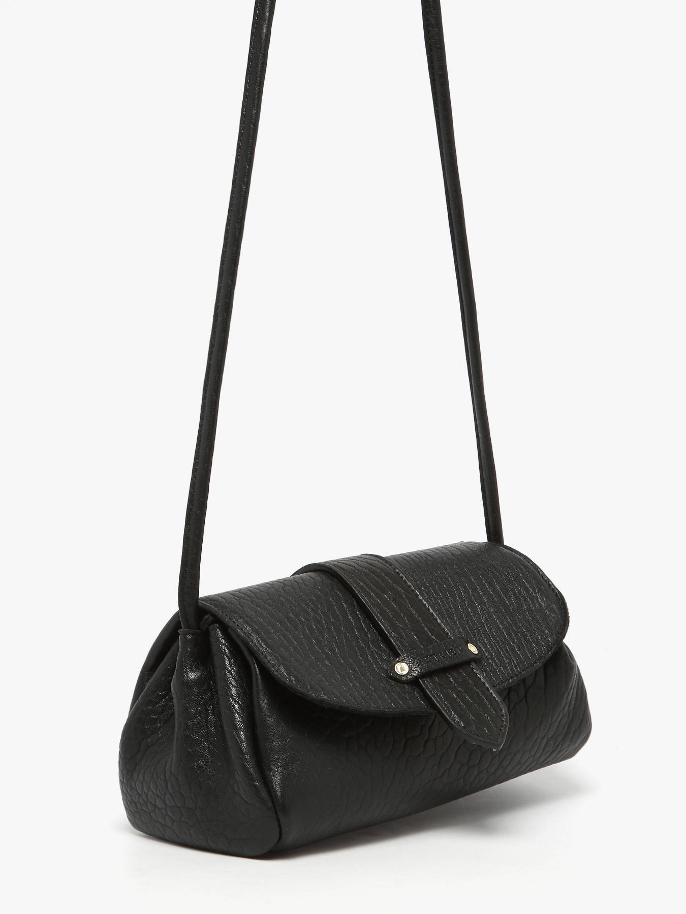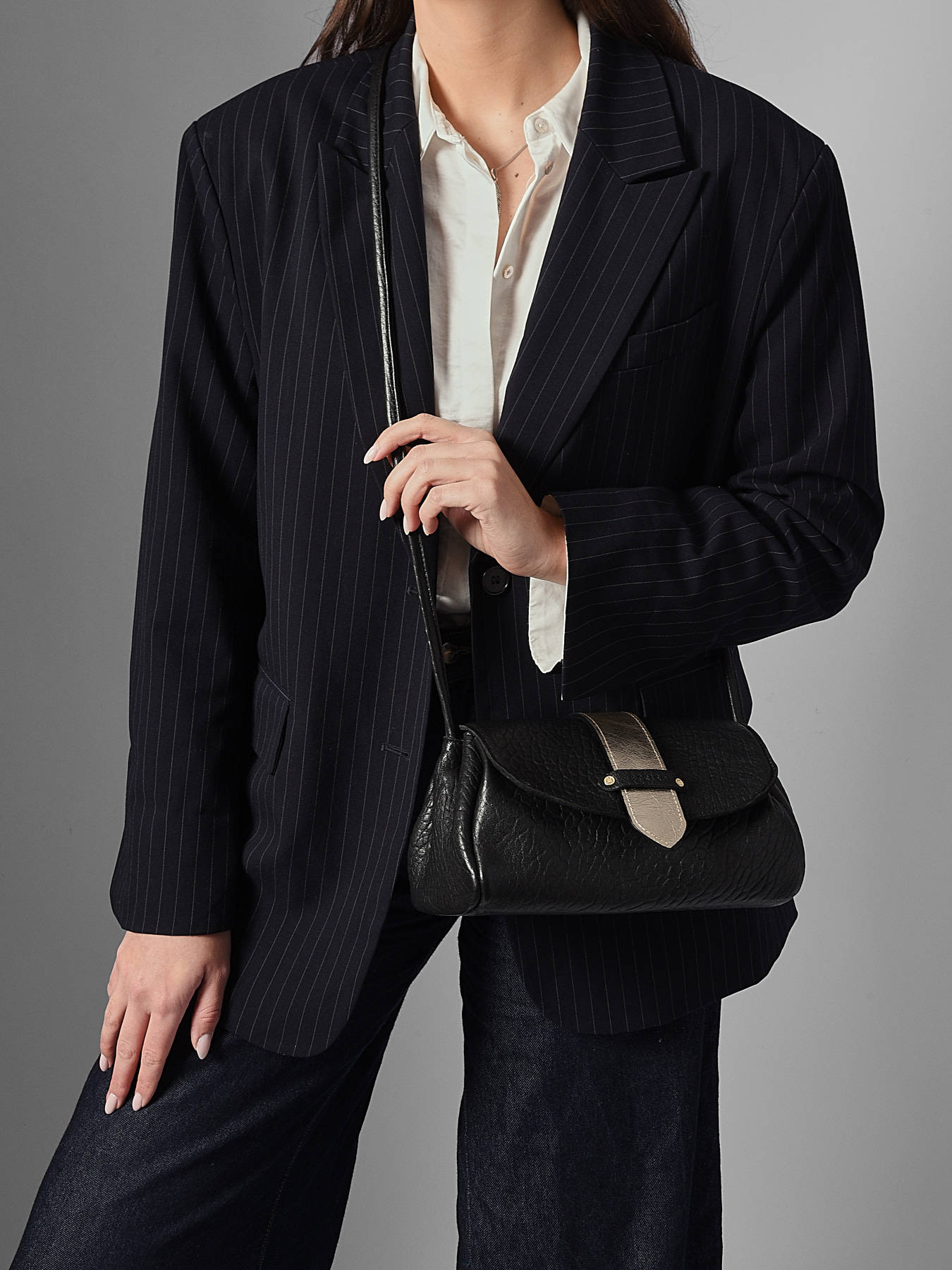 The AGNES crossbody bag by ETRIER is crafted from French crinkled lambskin leather. This model is shown here in size M and features a flap closure secured with a magnetic snap button. It is also available in size S for those who prefer a more generous capacity. This version comes with a reversible tab: one gold side and one side in matching leather, allowing you to personalize your bag depending on your style. The tab attaches easily thanks to two collar buttons and conveniently slips into a dedicated pocket at the back of the bag. The leather-lined interior includes three compartments, including a central zipped section, offering effortless organization for your personal belongings. The structured base ensures the bag maintains its shape over time. The natural leather patch embossed with the ETRIER logo is adorned with a small French flag, adding a refined and distinctive touch. The leather shoulder strap is set to 130 cm upon delivery and can be easily adjusted in height by retying the discreet knot inside the bag. Simply pull, untie the knot, adjust the length, and re-knot to achieve the perfect fit. Combining French craftsmanship with practical elegance, this bag is both timeless and versatile. For even more personalization, discover our collection of printed statement tabs available on our website.