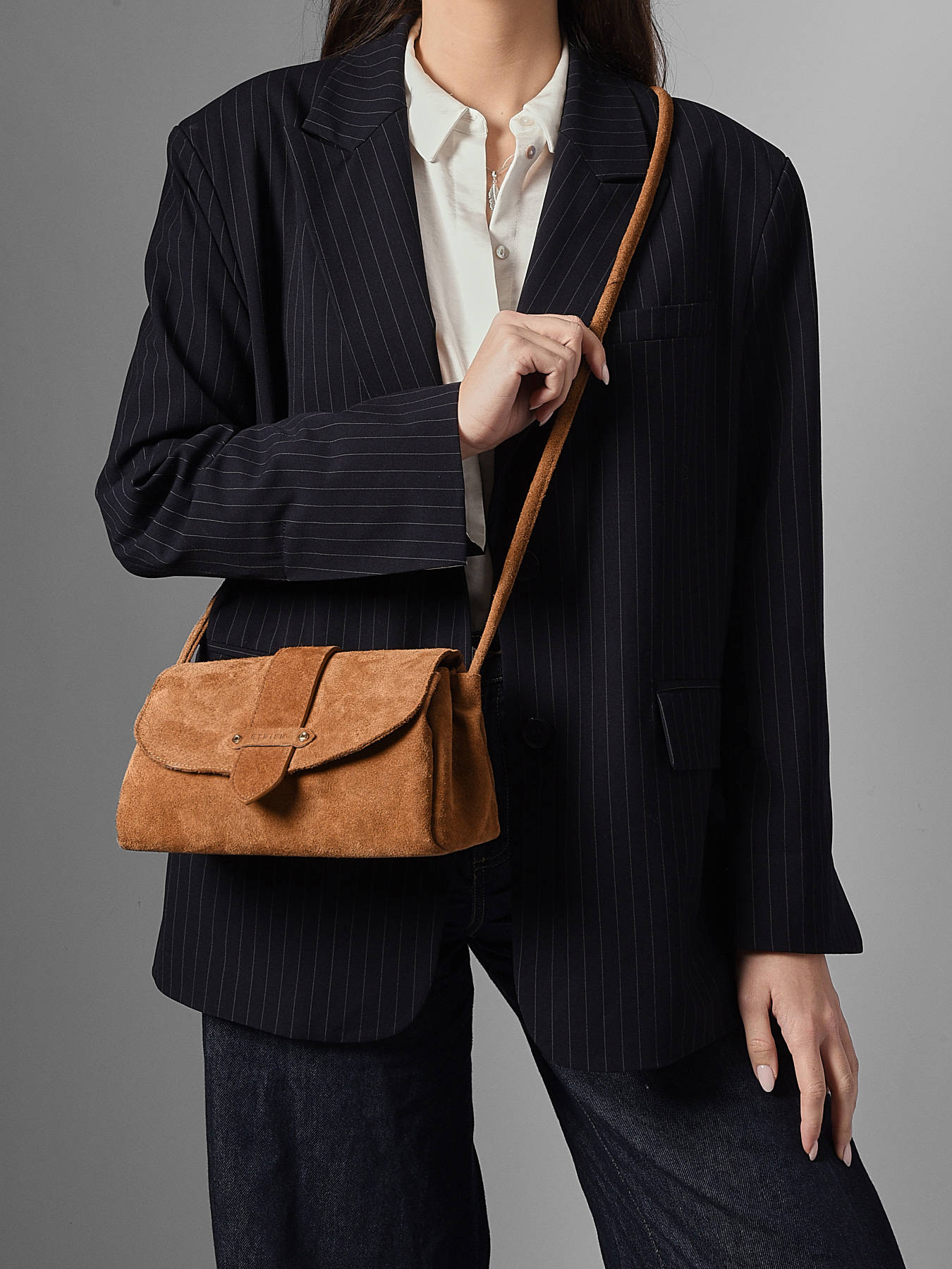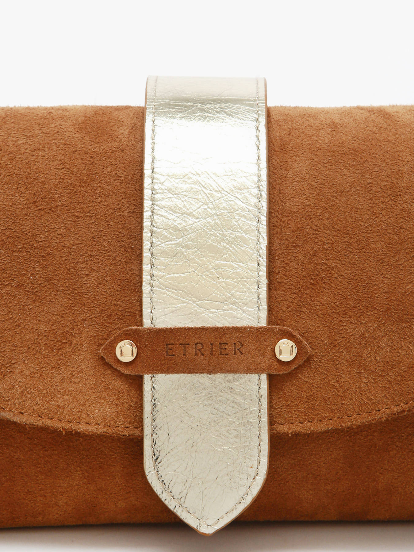The AGNES crossbody bag by ETRIER is crafted from Italian suede leather, offering a refined and soft texture. This model is shown here in size M and closes with a magnetic snap button under the flap. It is also available in size S for those who prefer a more compact format.