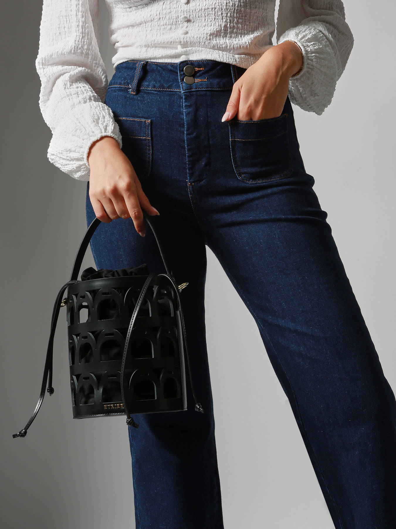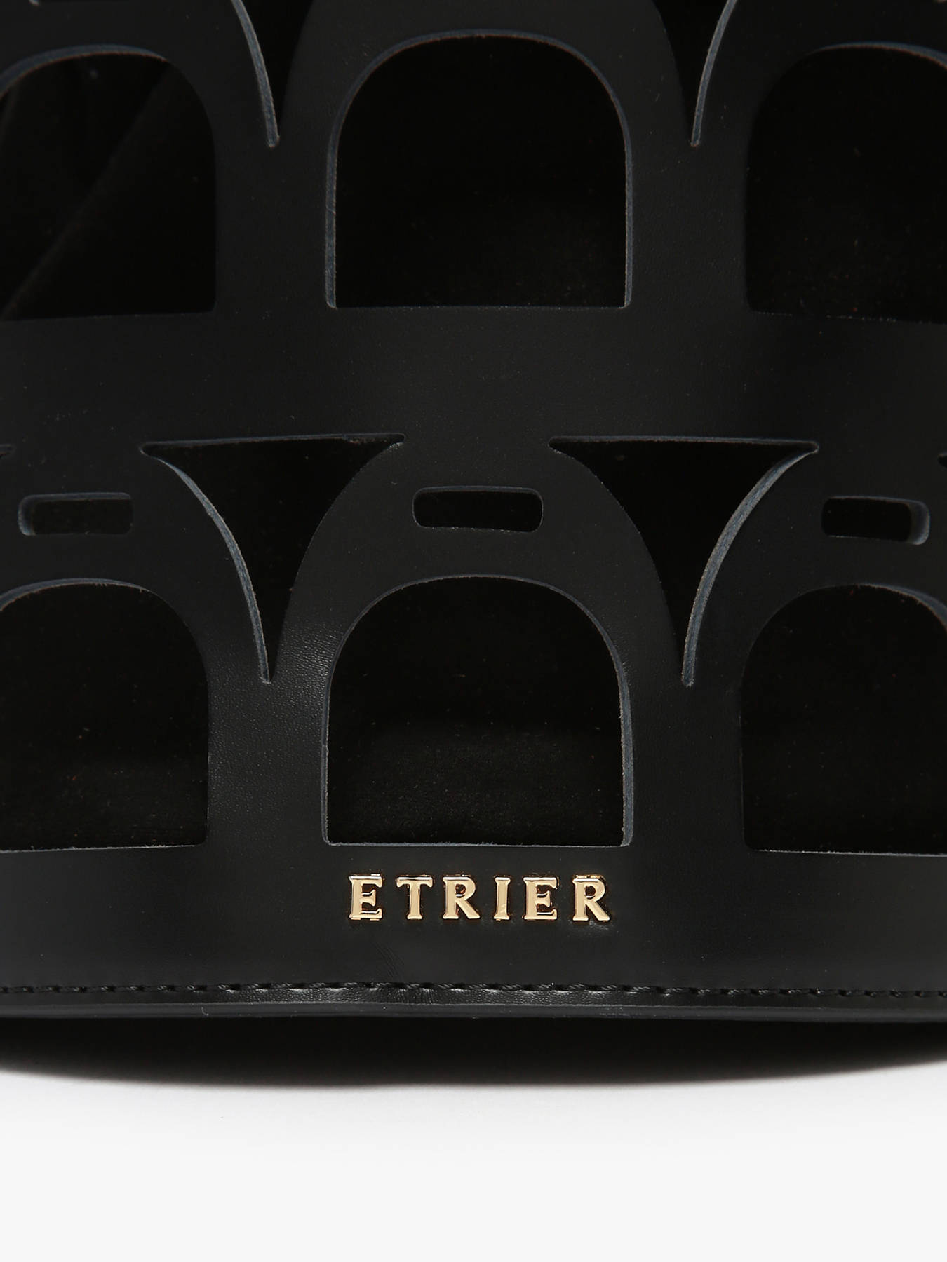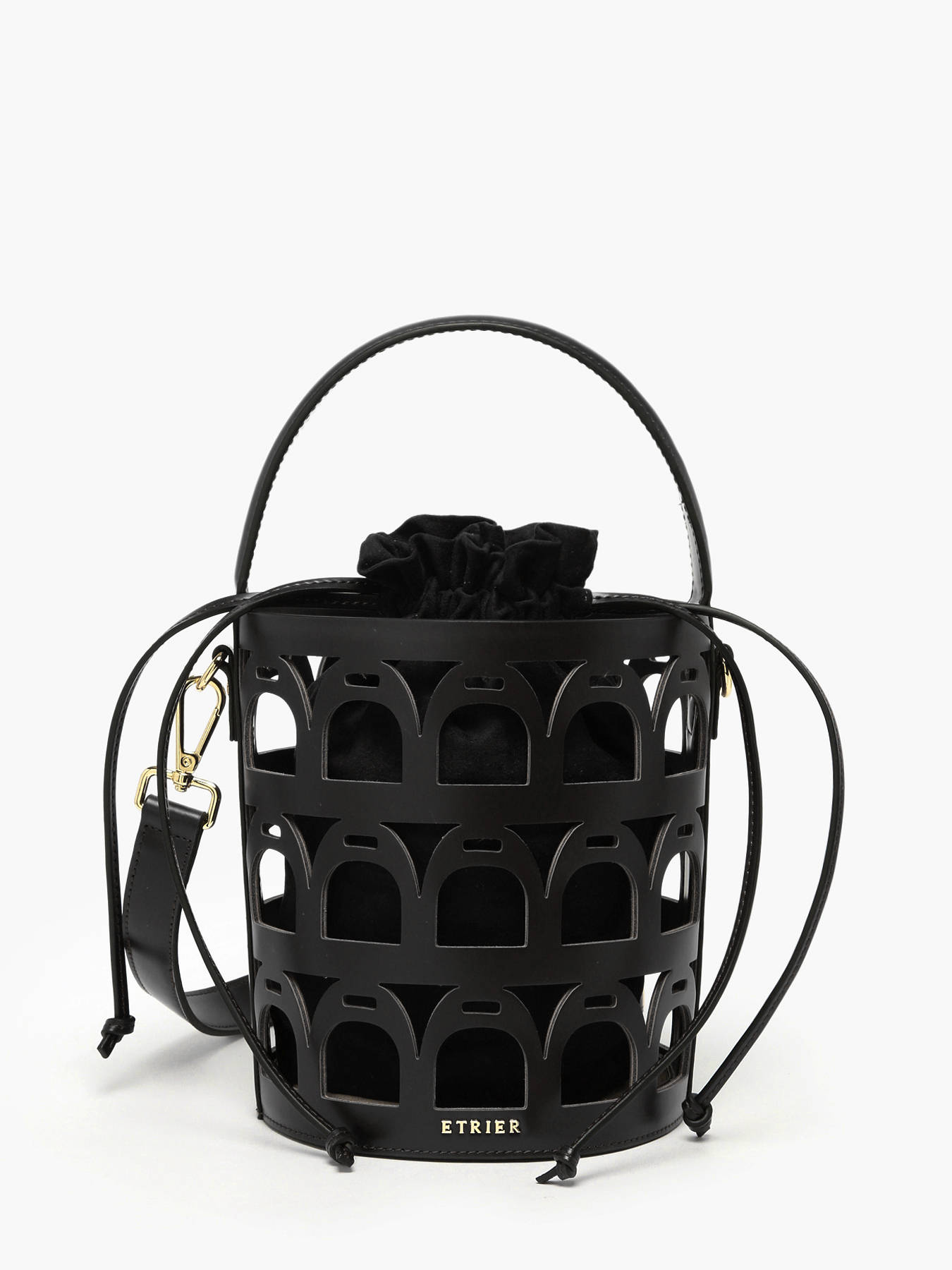The EPONA crossbody bag by ETRIER stands out with its structured, contemporary design. Crafted from leather, this bucket-style model features a rigid geometric silhouette and subtly integrated stirrups—a discreet yet iconic signature of the brand. It opens with a fabric drawstring pouch, which is secured to the bottom of the bag with a snap button for added stability. Designed to suit every style preference, it can be carried by hand with its top handle or worn crossbody thanks to the adjustable and removable strap. A modern and refined piece, perfect for adding structure and character to any outfit.